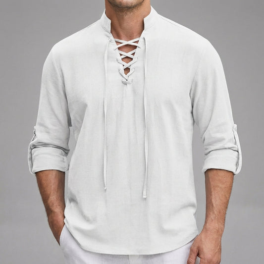 Relaxed-Fit Lace-Up Henley with Stand Collar and Roll-Tab Sleeves